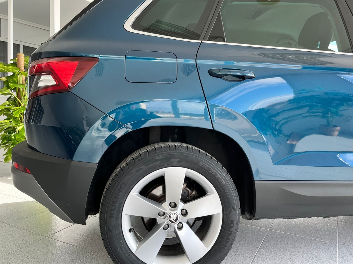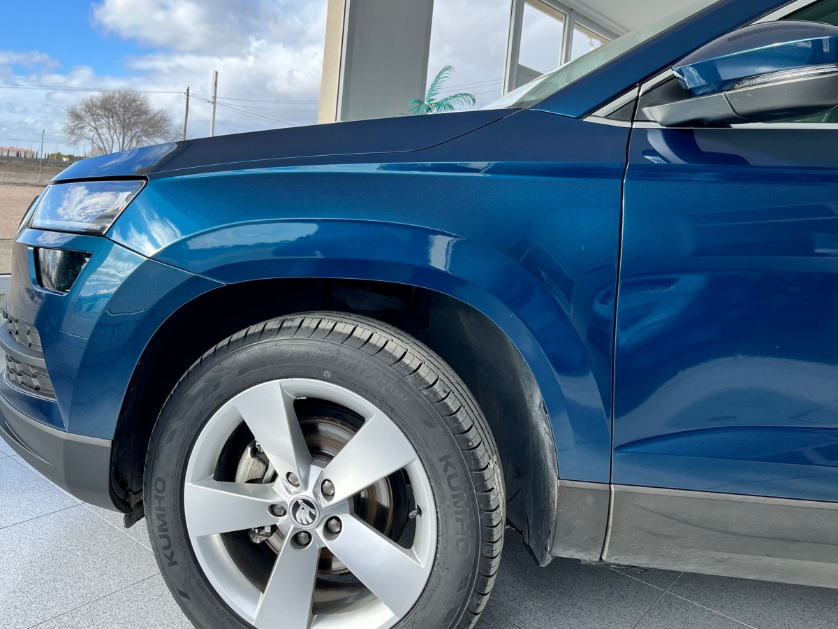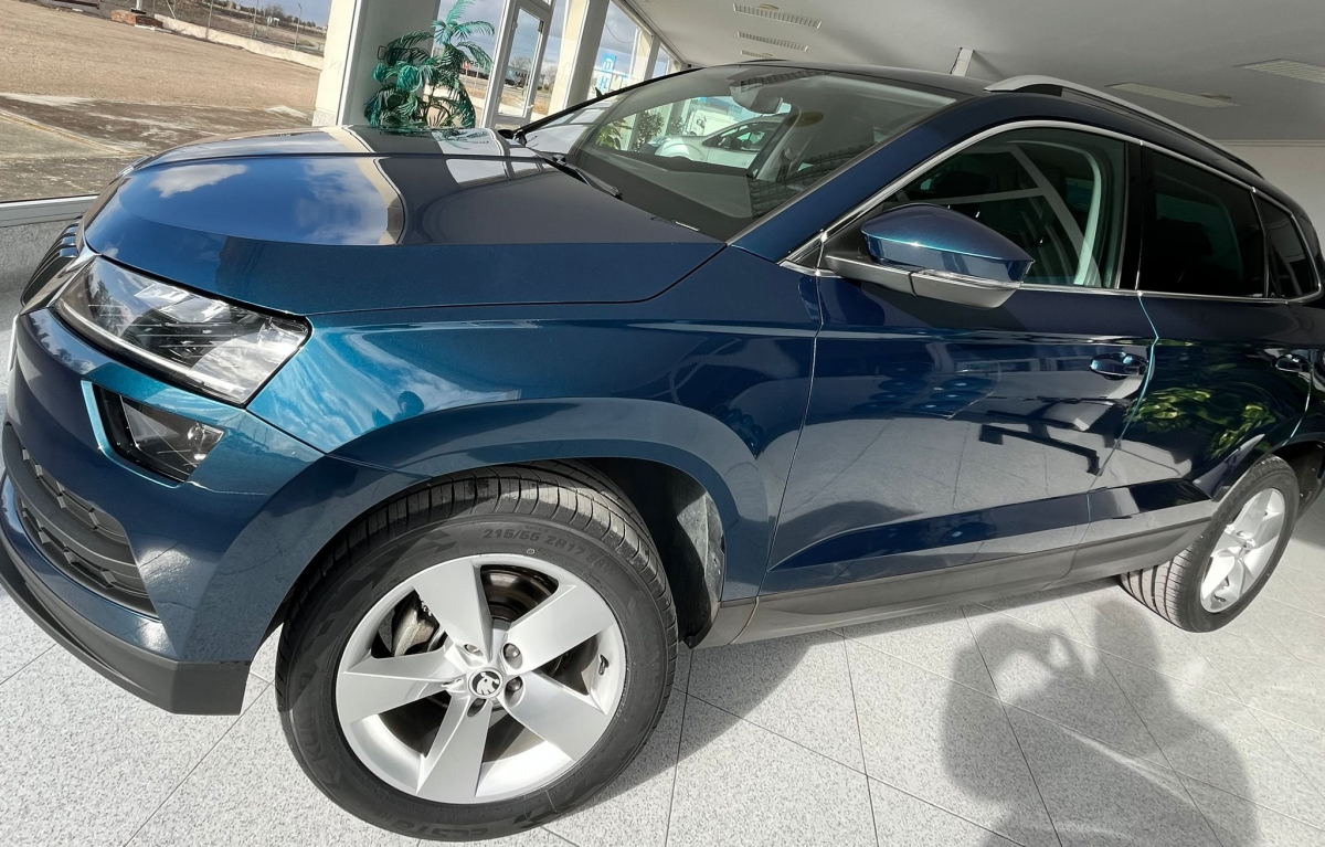 Skoda Karoq azul metalizado, SUV muy equilibrado, perfecto para el dia a dia y para viajes largos. Destaca por su comodidad, amplitud y seguridad, con una conduccion suave y posicion elevada.